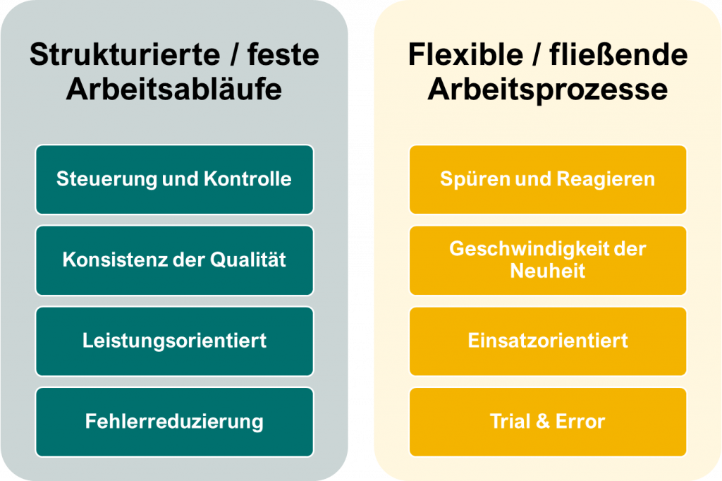 Hier treffen strukturierte, feste Arbeitsabläufe, die auf Kontrolle, konsistente Qualität und Fehlerreduzierung ausgelegt sind, auf flexible und fließende Prozesse, die früh in die Umsetzung gehen, Fehlschläge in Kauf nehmen und sich dem Ergebnis über Trial and Error annähern.